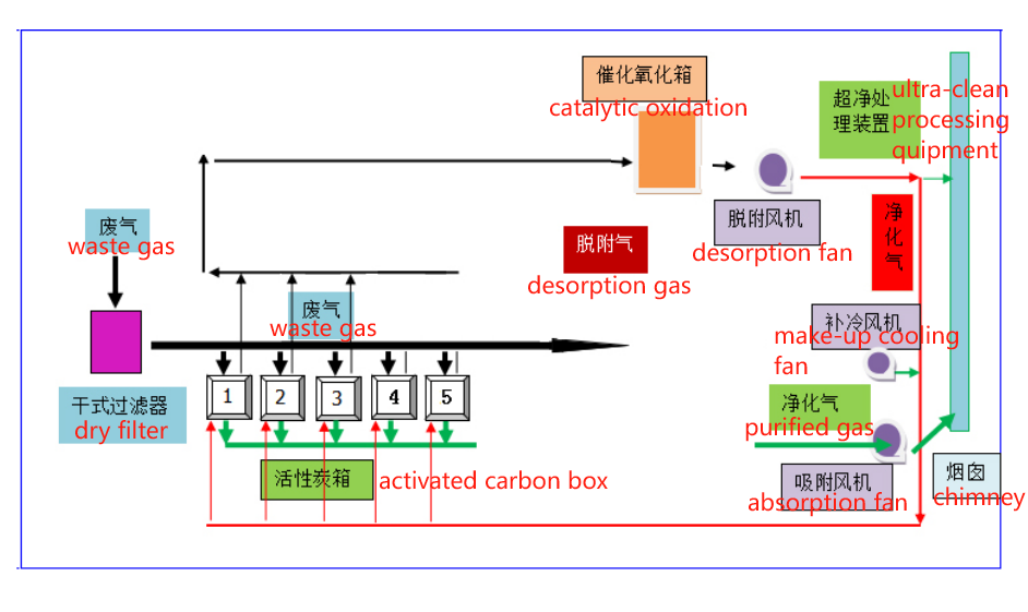 第一步:組合干式過濾箱:廢氣通過風管進入組合過濾箱進行二次預處理,進一步去除廢氣中的粉塵顆粒,保證進入活性炭的廢氣中顆粒物有效去除,保證其通道不被顆粒物堵塞,造成吸附效果差,延長使用壽命。過濾器上安裝有壓差表,保證廢氣處理系統正常、安全、穩定運行。 第二步:活性炭吸附濃縮處理:經過二次處理后的廢氣,進入活性炭吸附氣體中,本項目采用蜂窩活性炭作為吸附劑,其具有比表面積大,過流風速高、吸附容量大且疏水等特點,噴漆廢氣中的甲苯、二甲苯等污染性物質,被碳床截留吸附后,剩余的潔凈氣體則實現達標排放。 第三步:活性炭吸附:隨著吸附時間的進行,當其中一個活性炭吸附箱達到規定的吸附容量后,則系統會自動切換到其他干凈的活性炭箱替代該飽和箱體。飽和的箱體通過閥門切換進入脫附狀態。脫附方式采用熱空氣脫附,熱源來自催化燃燒機組,通過保溫脫附管道輸送。脫附溫度控制在100℃左右,由溫度傳感器實時傳遞給PLC控制系統監控,無需人為操控,減少風險發生幾率。 第四步:催化燃燒設備:脫附出來的廢氣具有氣量小、濃度高等特點,可利用本項目的催化燃燒機組進行深度處理。VOCs經過貴金屬催化劑和高溫的共同作用下,被分解成二氧化碳和水等無害物質。 第五步:達標排放:通過多級處理達到國家排放標準的氣體,通過引風機抽送至主煙囪,達標排入大氣。